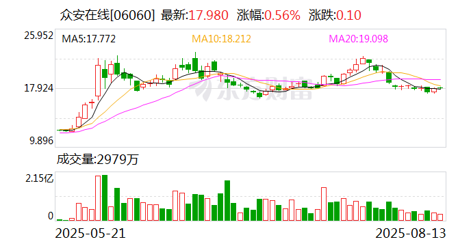 今年以来,众安在线股价连续攀升,股价一度突破21港元/股。8月13日,众安在线股价收于17.98港元/股,较年初股价涨幅超50%。